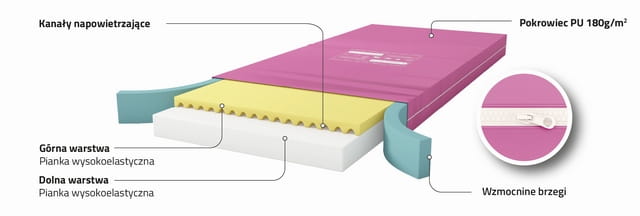 Kanały napowietrzające. System podłużnych kanałów napowietrzających zapewniający odpowiednią cyrkulację powietrza - rozwiązanie mające ogromne znaczenie w profilaktyce odleżyn.